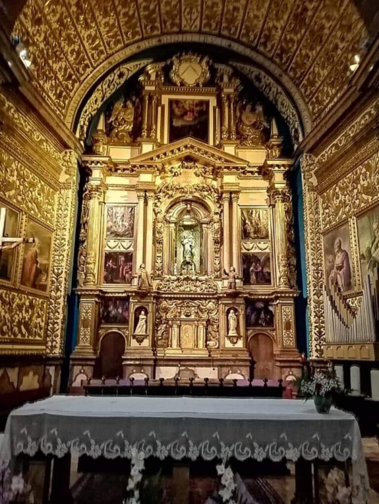 Si la piedra dominaba el exterior del edificio, su interior se presenta como una suerte de cofre dorado, pues los motivos ornamentales áureos recorren todo el complejo, enfatizándose en el retablo mayor, obra del maestro Jaume Blanquer, en el que encontramos la imagen de la Virgen en un nicho rotatorio. Se trata de un templo de cruz latina, con una sola nave y capillas laterales intercomunicadas, cubierto con bóveda de cañón, salvo el crucero, que está rematado con una cúpula en la que puede leerse claramente la inscripción: “Ave María”.